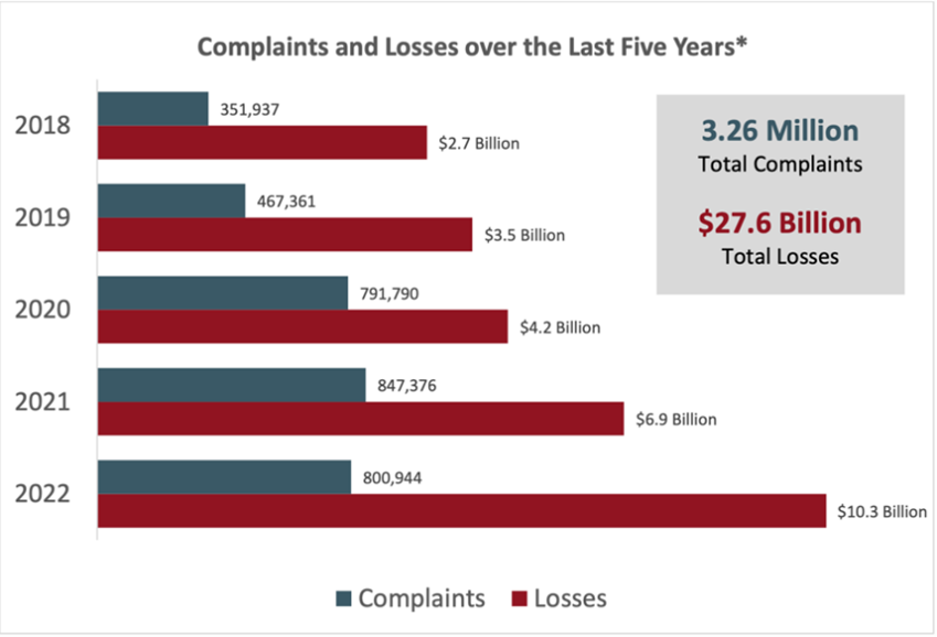 最新のレポートによると、年々犯罪件数は増えていませんが被害額が増加しているそうです。2022年は前年と比較して40%強の増加となっていると報告されています。件数が増えず被害額が増えるということは、一つの事件に巻き込まれた際の被害額が増加しているんですね。